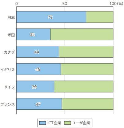 白書の中に、「主要国におけるICT人材の配置」がグラフで表現されています。
