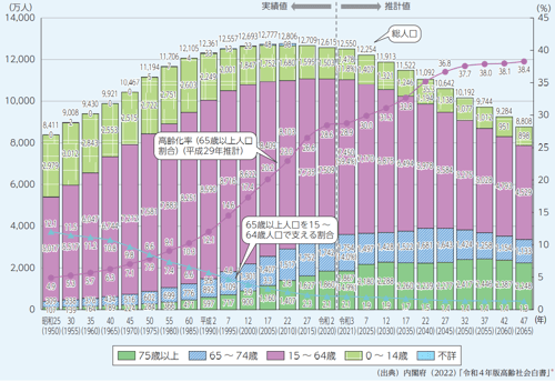 日本における過去、現在、未来の人口の推移を示すグラフが載っていました。総人口としては、2010年の1億2,800万人をピークに減少傾向となり、予測では2065年に8,800万人にまで減少するとのことです。