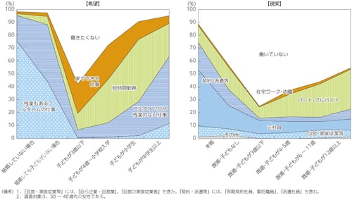 総人口に占める生産年齢人口の割合が減少すると、その減った分の労働力を補う必要があります。外国人の力を借りる、ITによる自動化などの手段もありますが、「働きたくても働けない」人達の力を借りるという点も重要だと思います。以前の投稿「「働き方改革」を再考する その3 ~国内出生数90万人割れの現実とどう向き合うか~」でも触れたことがありますが、平成26年版情報通信白書に「女性におけるライフステージの理想と現実」という説明があります。自身の子供が4歳以降になってくると、「家でできる仕事」や「短時間勤務」の希望は高まっている傾向にある一方、現実は希望通りの働き方ができていない状況にある、とされています。